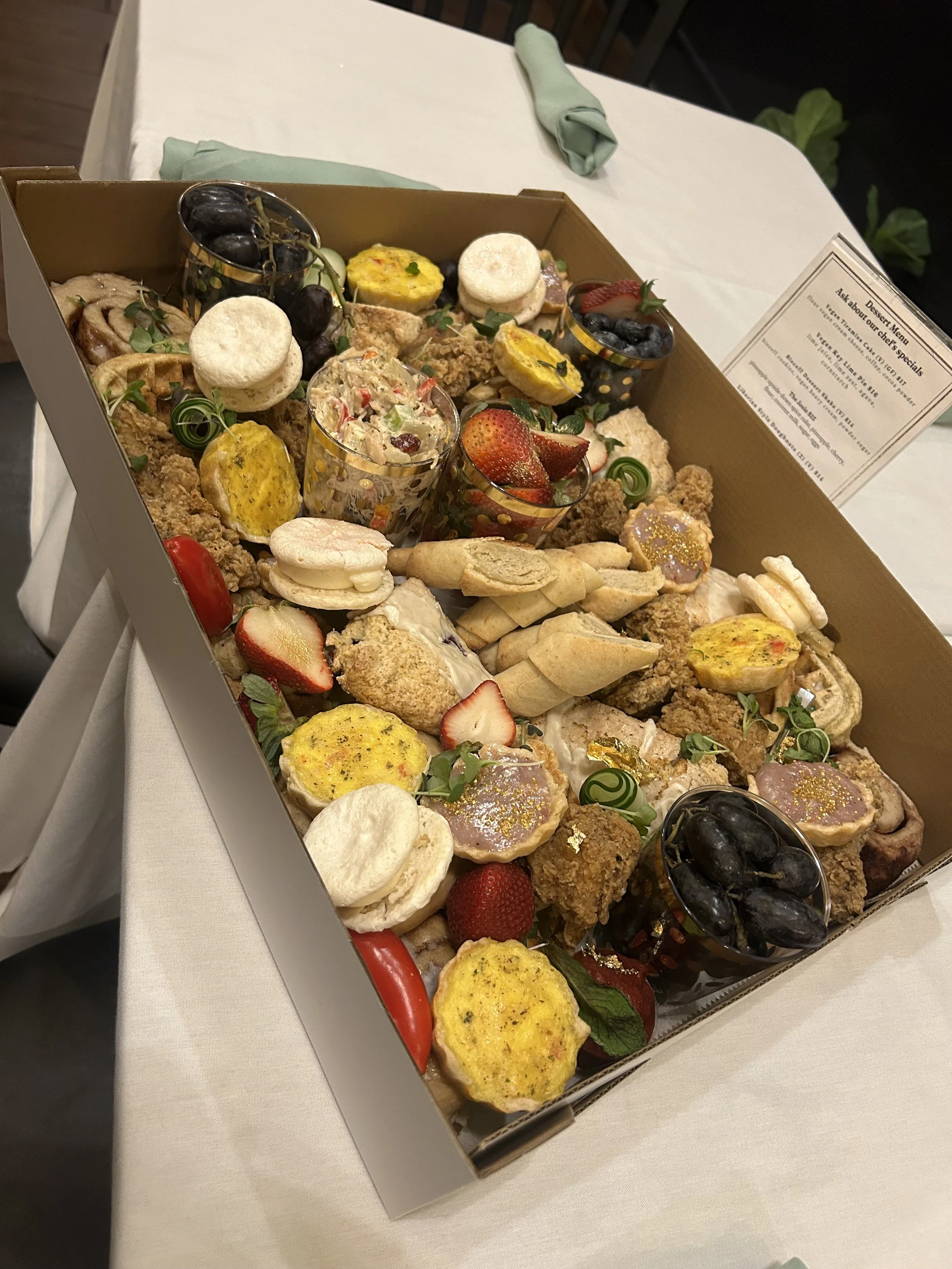 Everything in the box can be reheated except the tarts and fresh fruit.